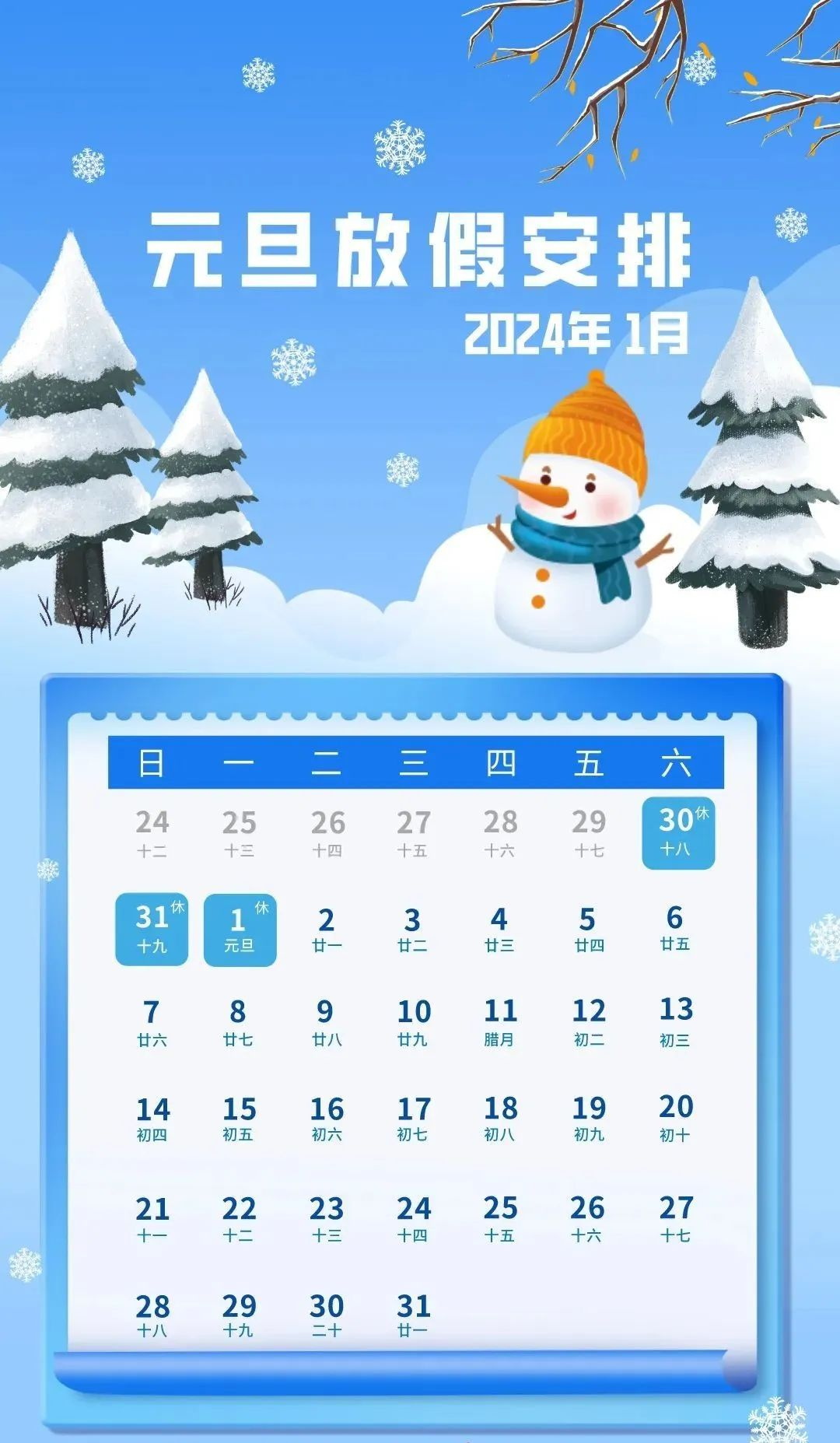 根據(jù)《國(guó)務(wù)院辦公廳關(guān)于2024年部分節(jié)假日安排的通知》精神,現(xiàn)將2024年元旦放假安排通知如下:
